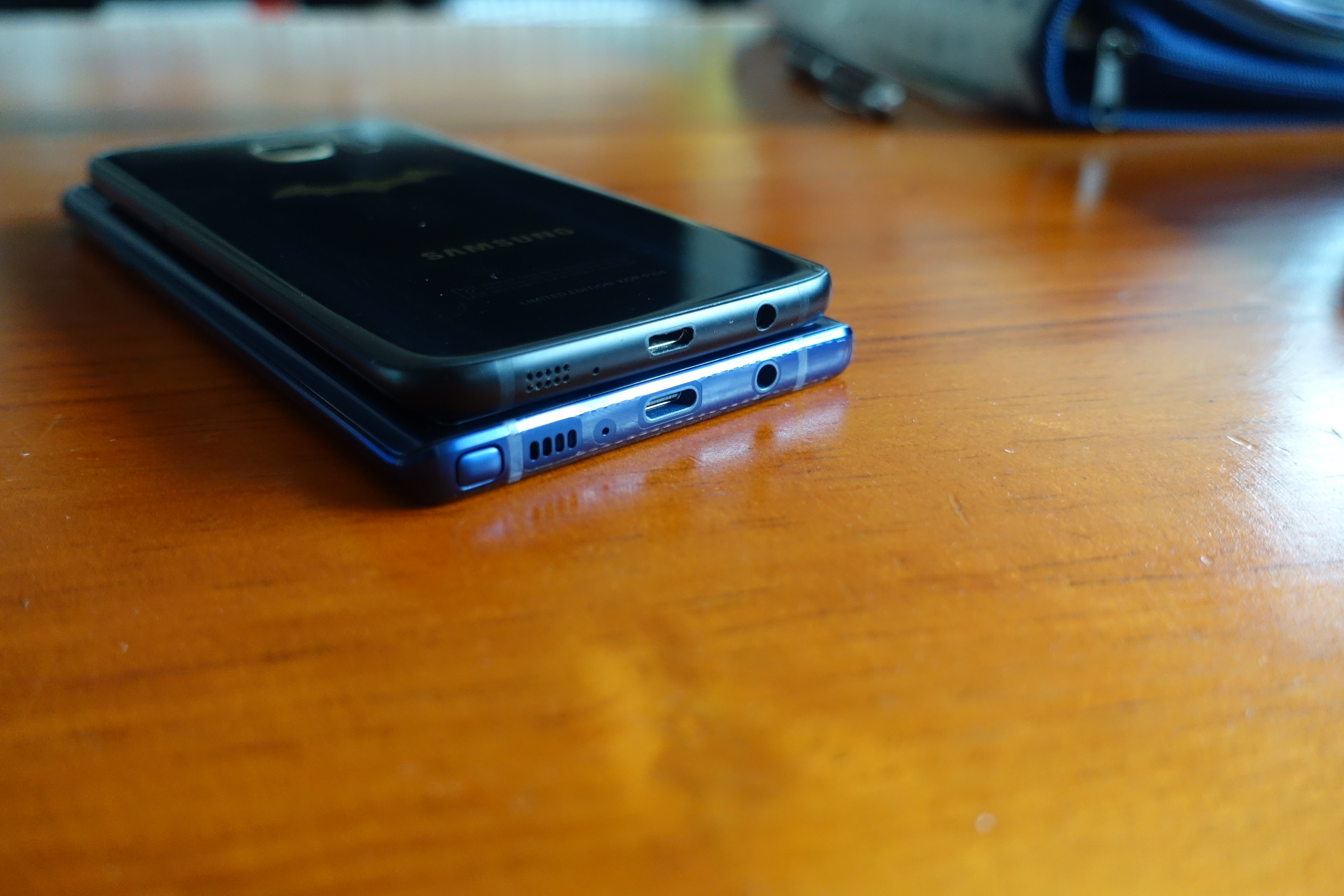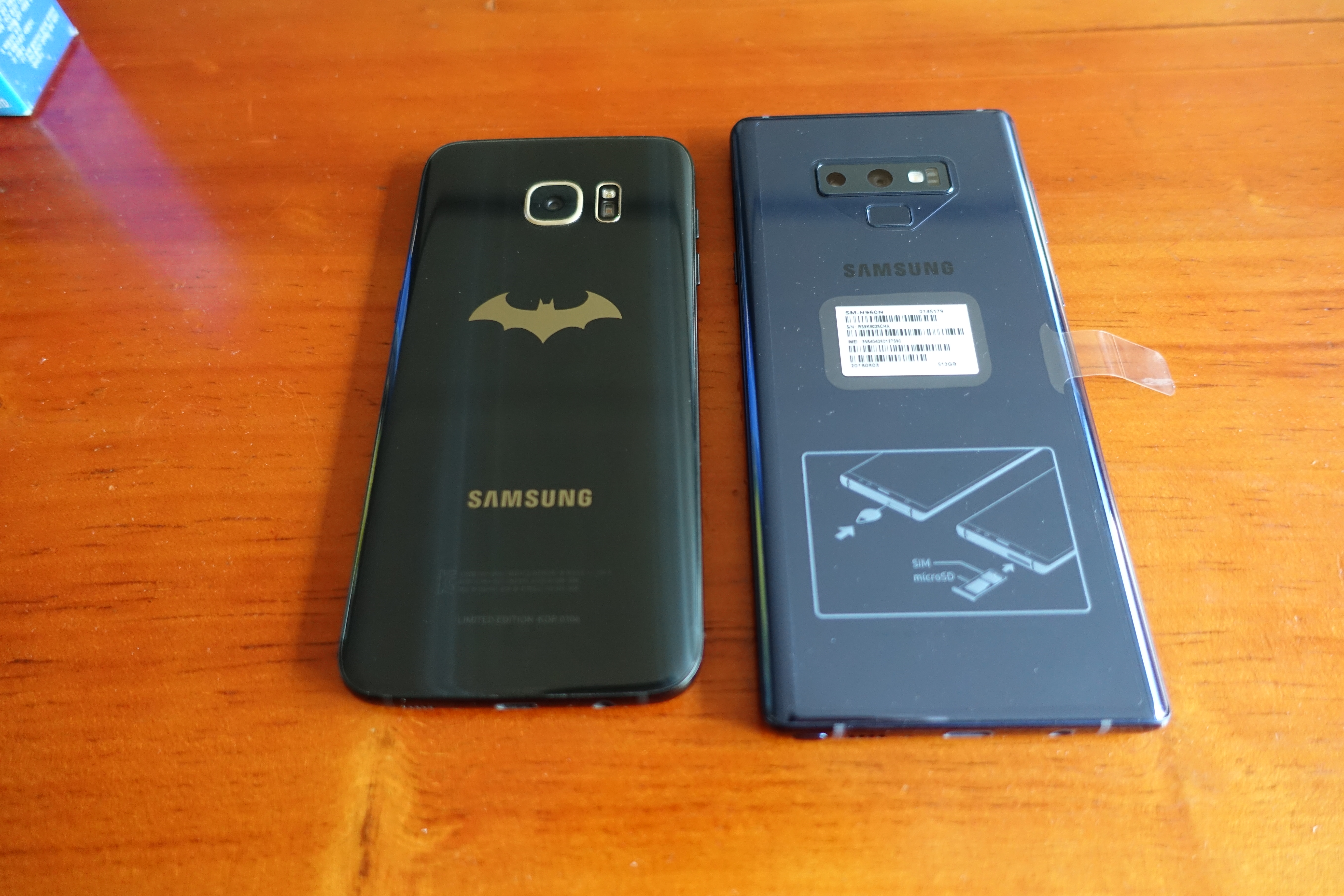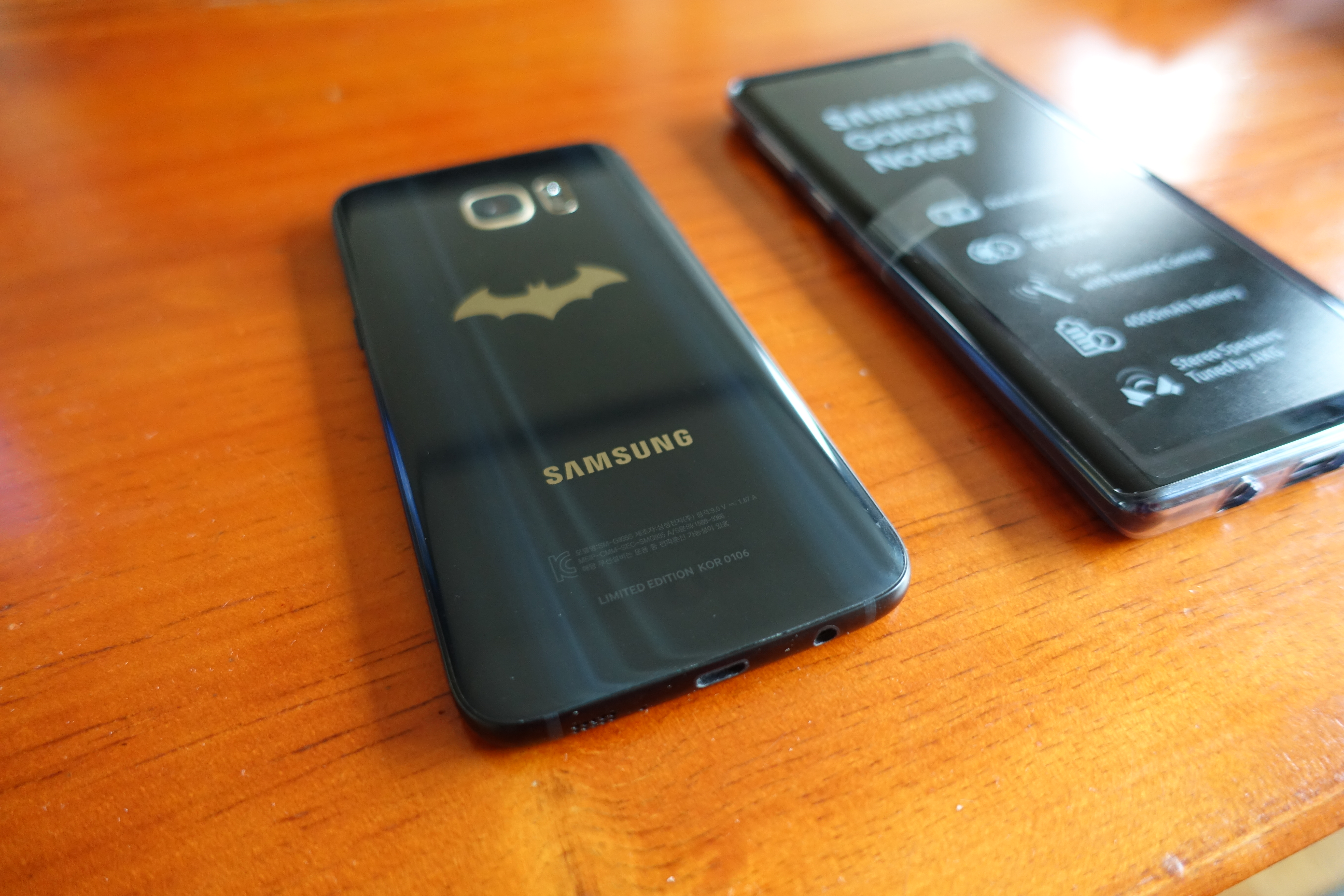 이전에 쓰던 기종인 갤럭시S7 배트맨에디션. 넣어놓기전에 비교샷을 찍어보았다. 기존의 둥글둥글한 이미지에서 각집힌 노트만의 디자인으로 변모했고 카메라부도 조금 더 복잡해졌다.